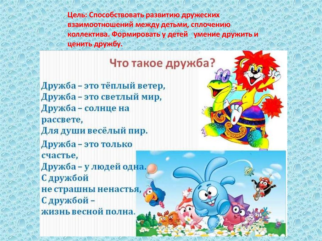 Цель: Способствовать развитию дружескихвзаимоотношений между детьми, сплочению