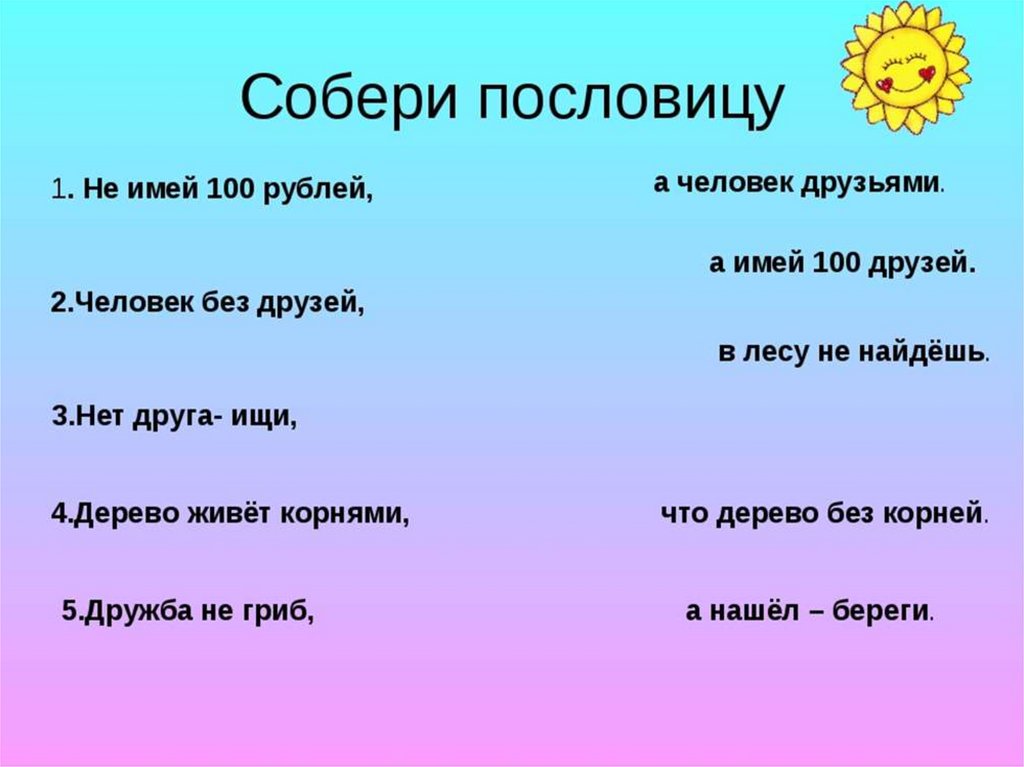 Пословицы:1. Не имей 100 рублей, а имей 100 друзей