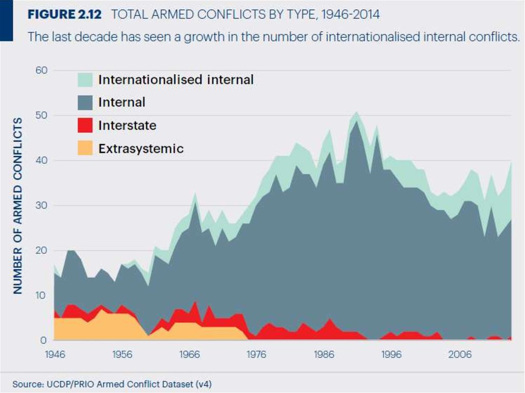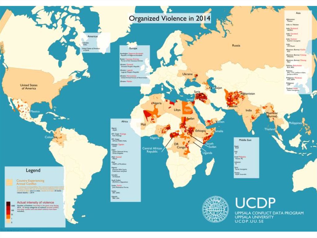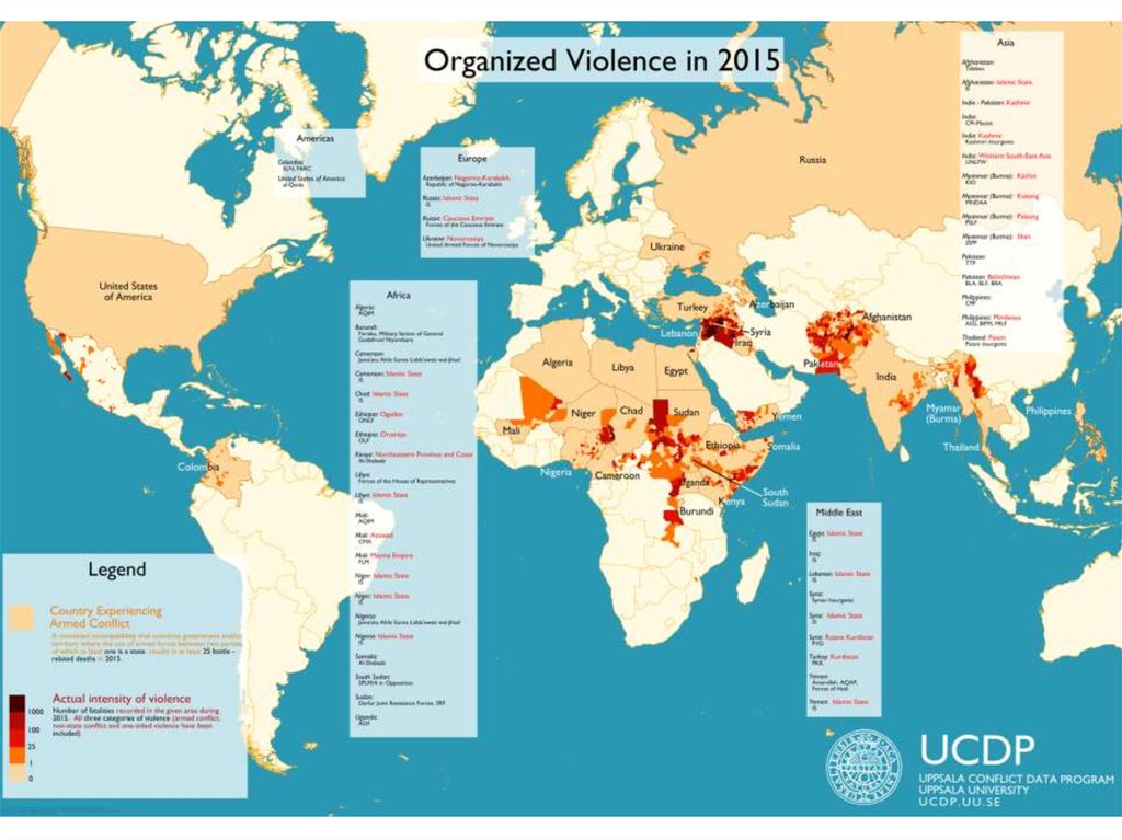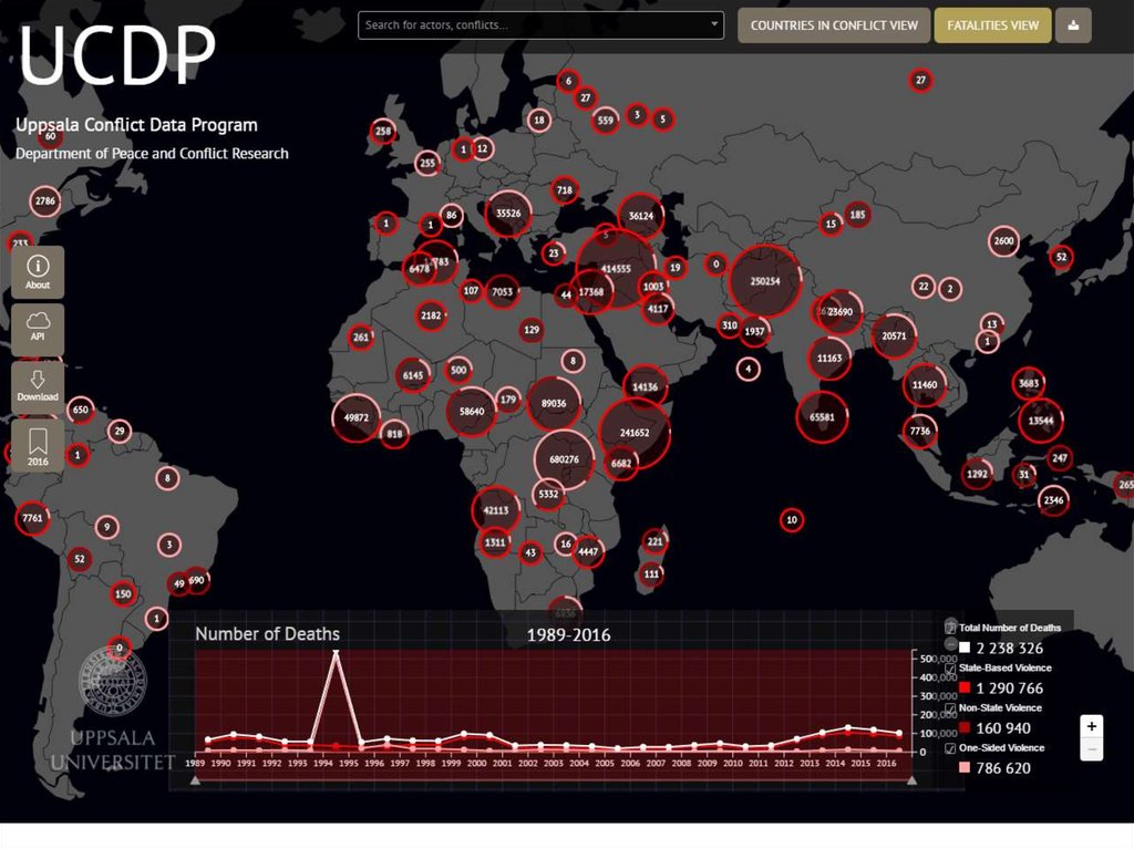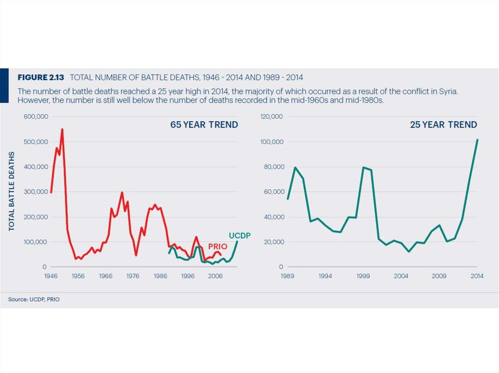 Война и мир. Число погибших в вооруженных конфликтах по оценкам ВОЗ, мир в целом, 1990-2015 годы