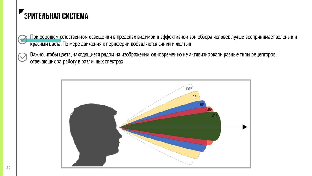При хорошем естественном освещении в пределах видимой и эффективной зон обзора человек лучше воспринимает зелёный икрасный цвета. По мере движения к периферии добавляются синий и жёлтый