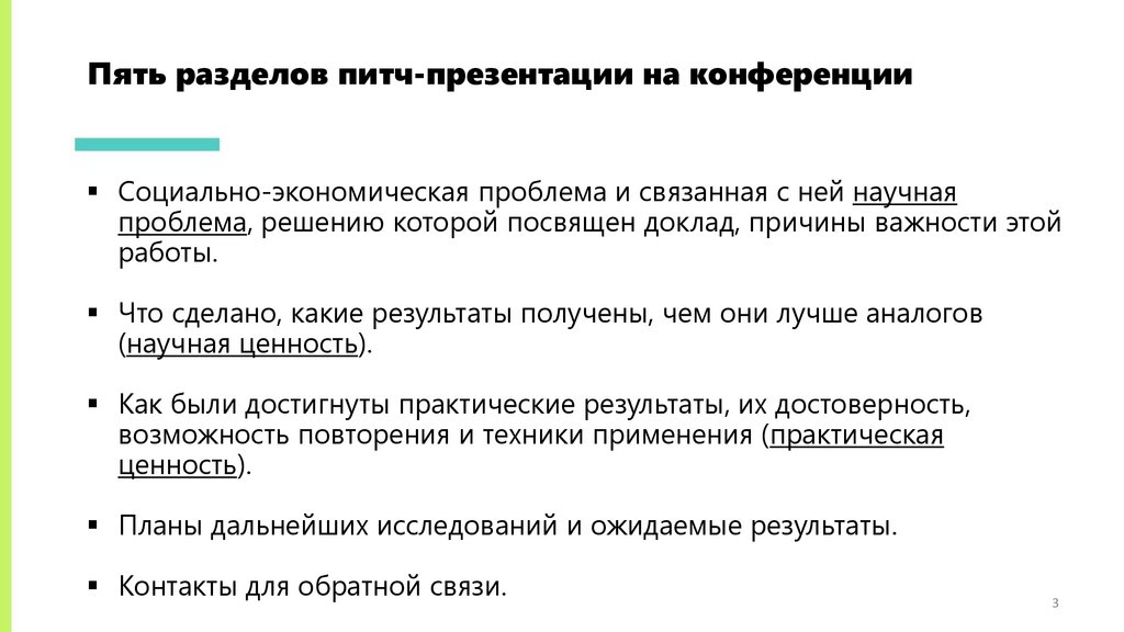 Пять разделов питч-презентации на конференции▪ Социально-экономическая проблема и связанная с ней научная