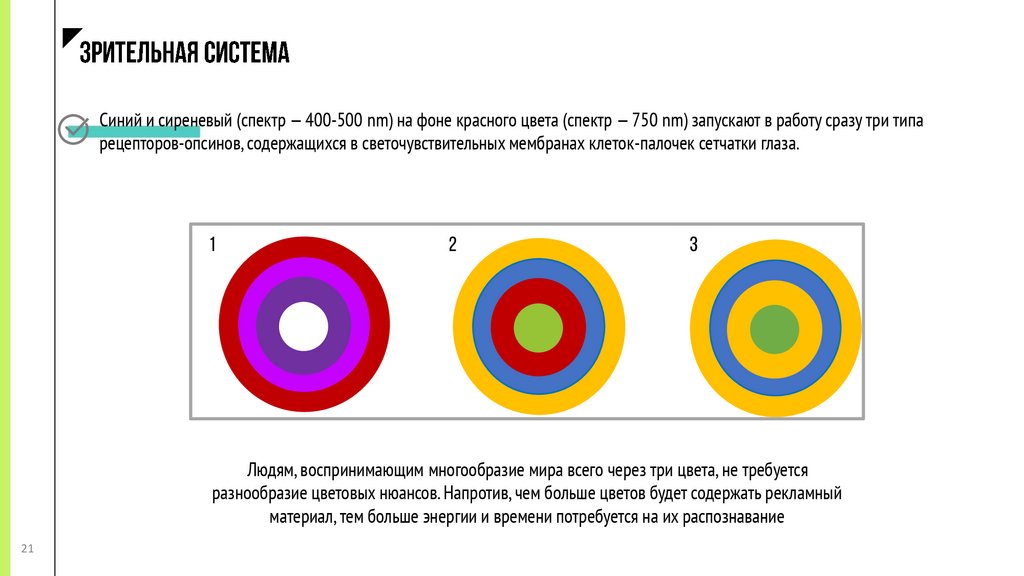 Синий и сиреневый (спектр — 400-500 nm) на фоне красного цвета (спектр — 750 nm) запускают в работу сразу три типарецепторов-опсинов, содержащихся в светочувствительных мембранах клеток-палочек сетчатки глаза.