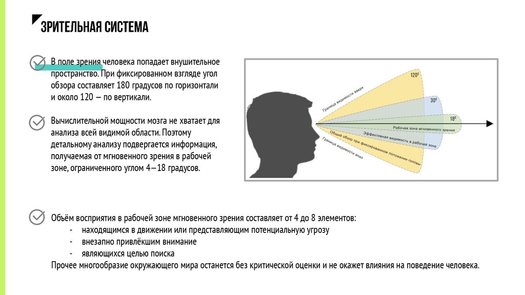 В поле зрения человека попадает внушительноепространство. При фиксированном взгляде угол