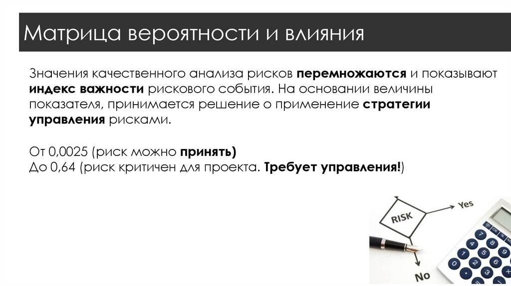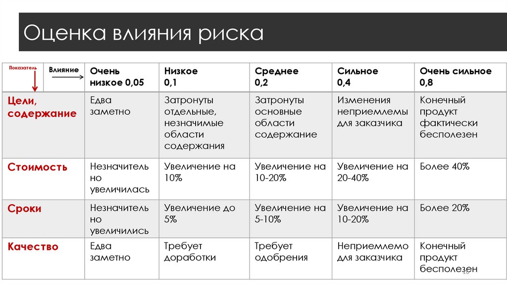 Матрица вероятности и влиянияЗначения качественного анализа рисков перемножаются и показывают