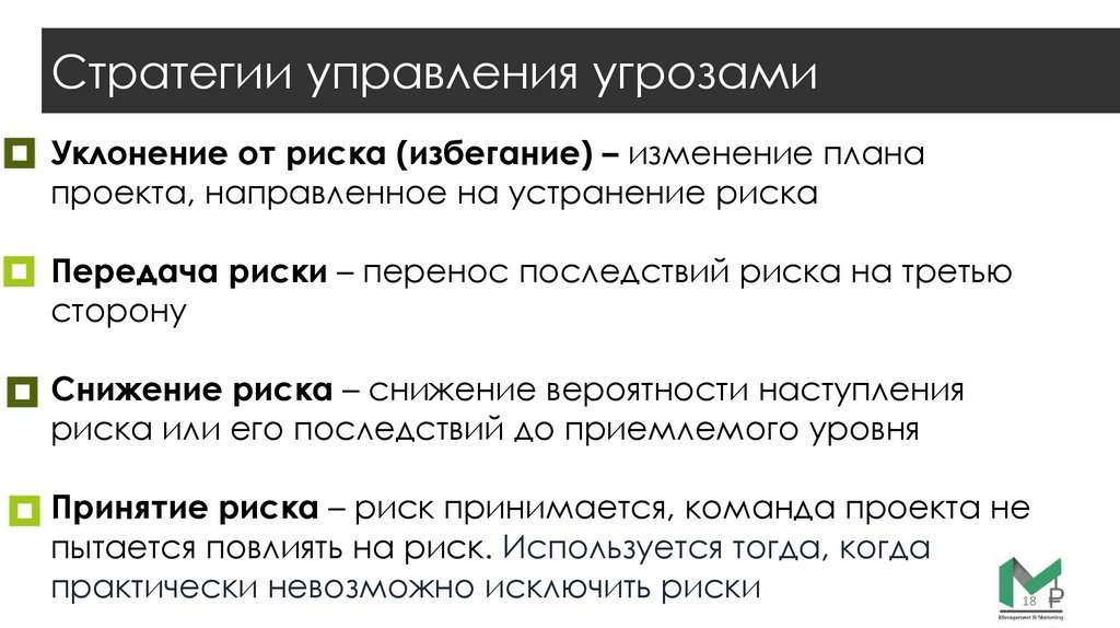 Стратегии управления угрозамиУклонение от риска (избегание) – изменение плана