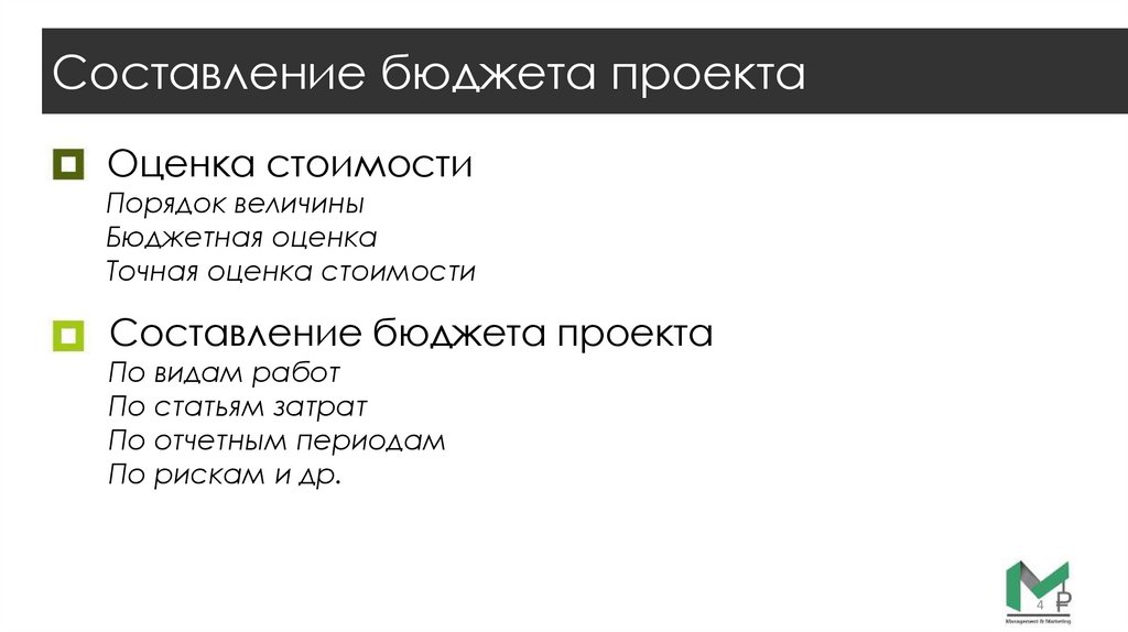 Составление бюджета проектаОценка стоимости