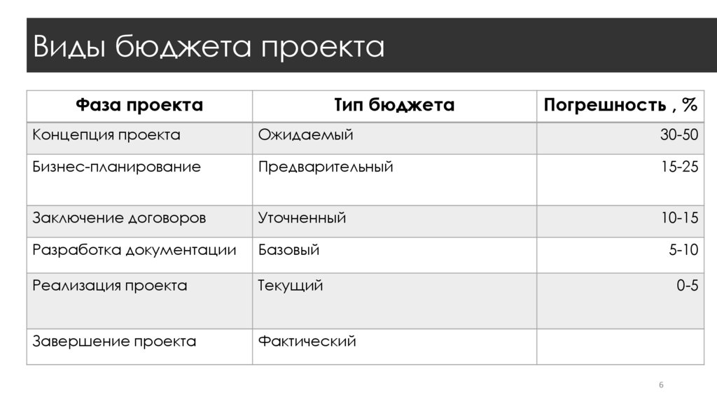 Виды бюджета проектаФаза проекта