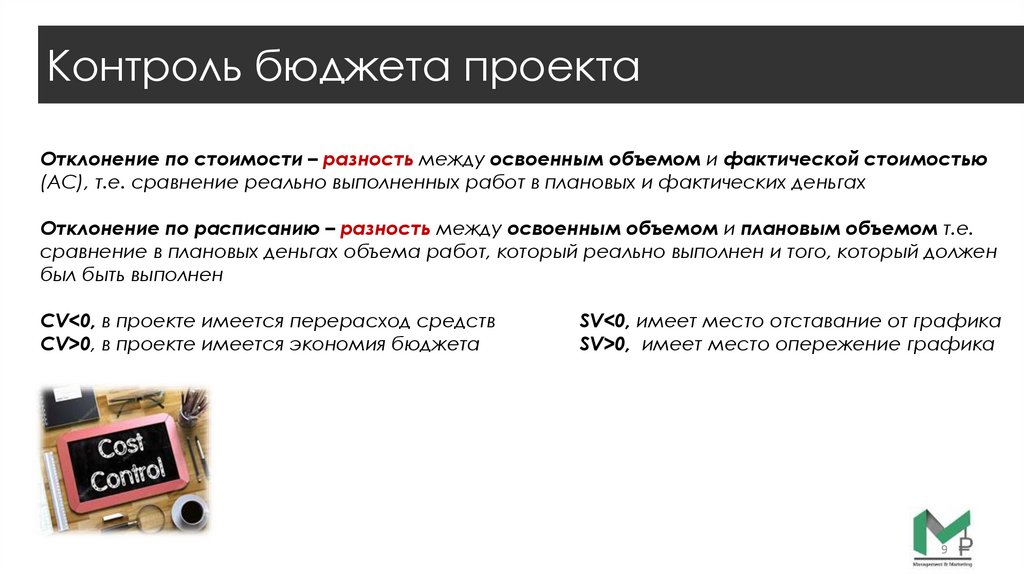 Контроль бюджета проектаОтклонение по стоимости – разность между освоенным объемом и фактической стоимостью