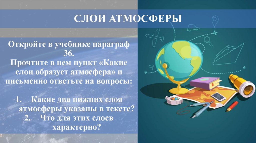 СЛОИ АТМОСФЕРЫОткройте в учебнике параграф