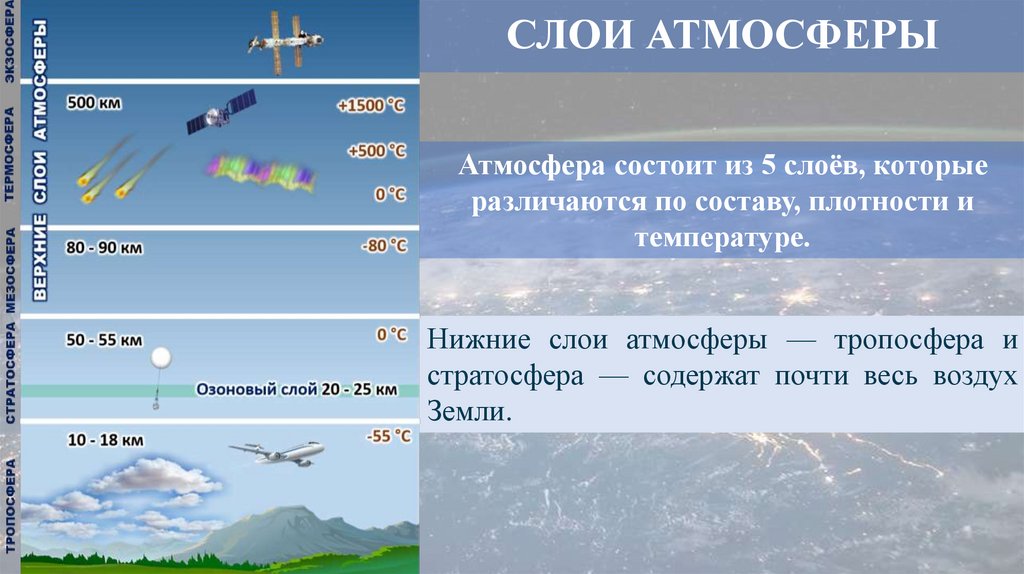 СЛОИ АТМОСФЕРЫАтмосфера состоит из 5 слоёв, которые