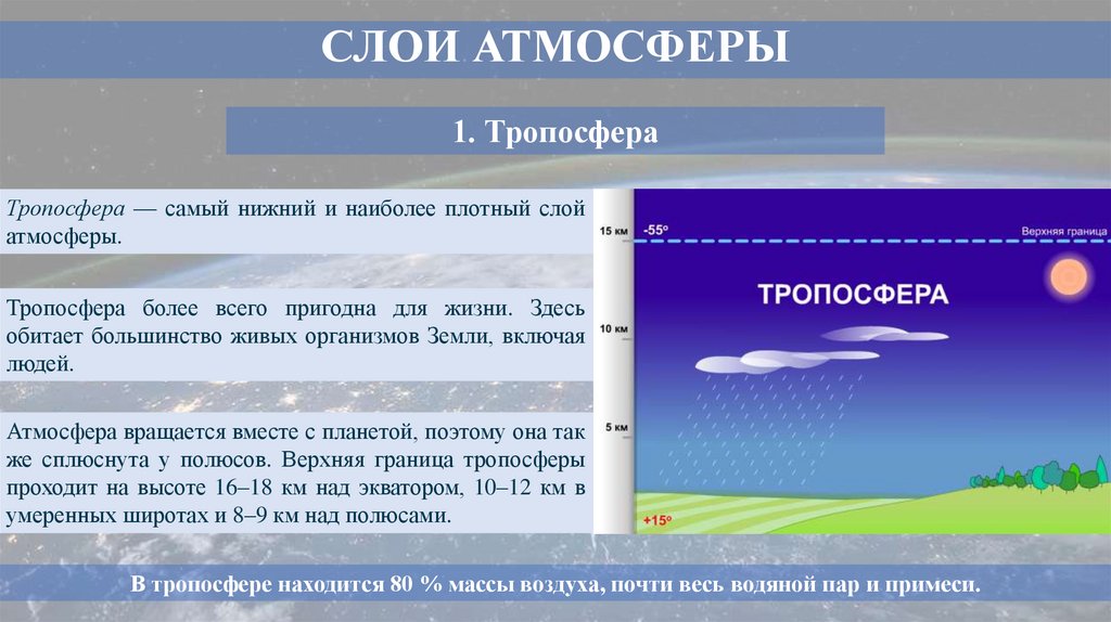 В тропосфере находится 80 % массы воздуха, почти весь водяной пар и примеси.