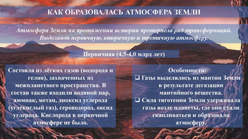 КАК ОБРАЗОВАЛАСЬ АТМОСФЕРА ЗЕМЛИАтмосфера Земли на протяжении истории претерпела ряд трансформаций.
