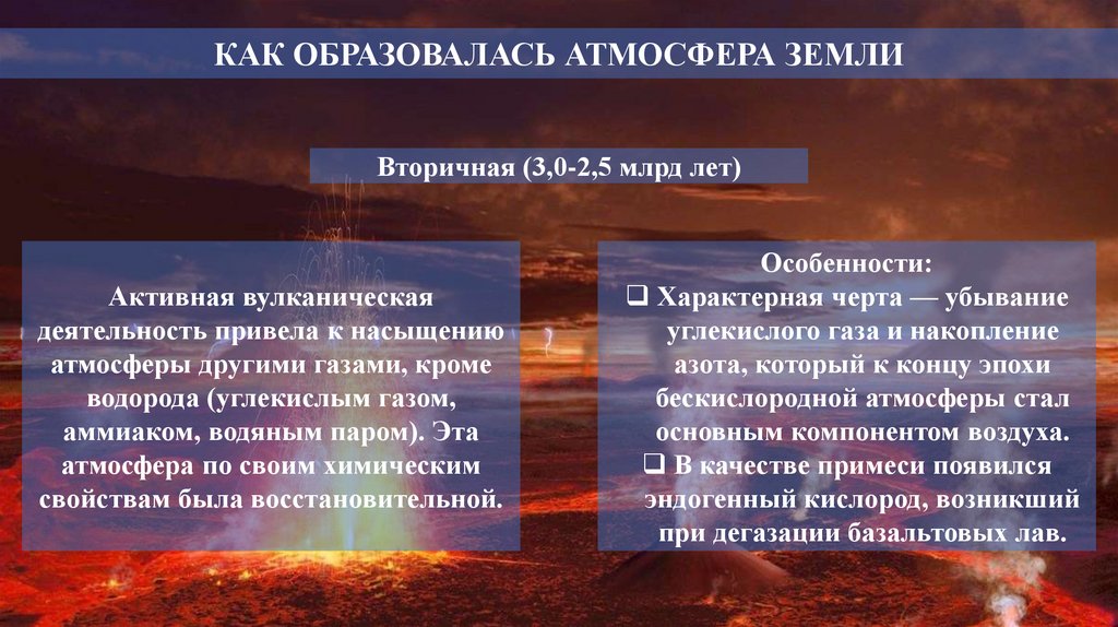 КАК ОБРАЗОВАЛАСЬ АТМОСФЕРА ЗЕМЛИВторичная (3,0-2,5 млрд лет)