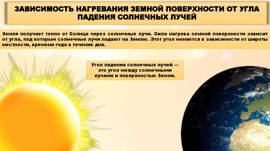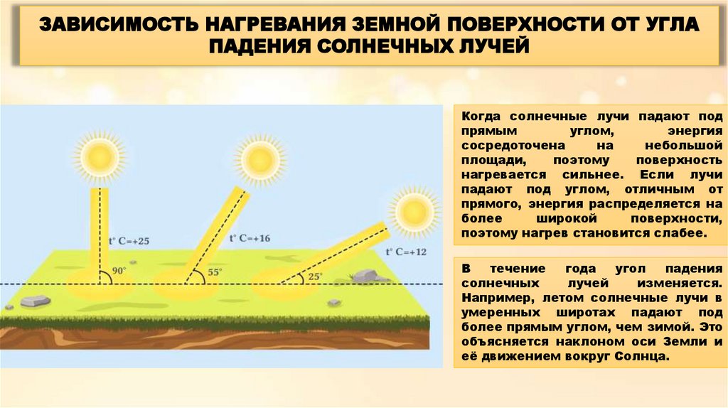 Земля получает тепло от Солнца через солнечные лучи. Сила нагрева земной поверхности зависит