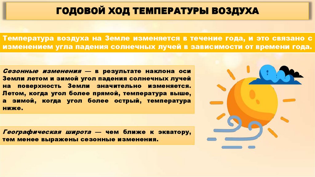 ГОДОВОЙ ХОД ТЕМПЕРАТУРЫ ВОЗДУХАТемпература воздуха на Земле изменяется в течение года, и это связано с