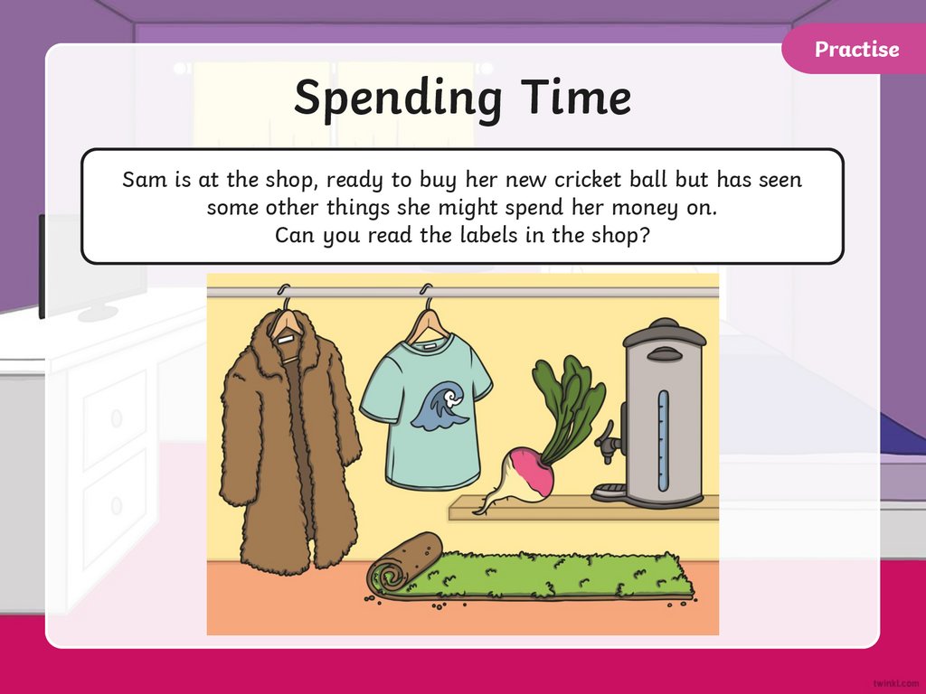Sam is at the shop, ready to buy her new cricket ball but has seen