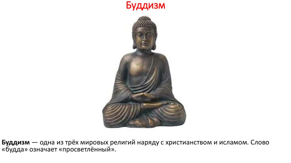 Буддизм — одна из трёх мировых религий наряду с христианством и исламом. Слово«будда» означает «просветлённый».