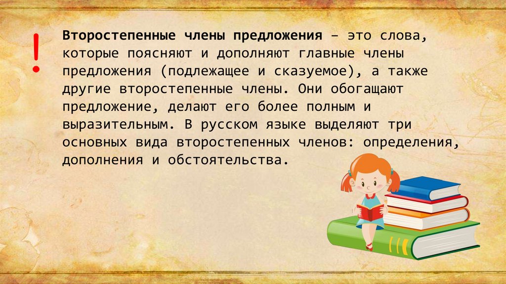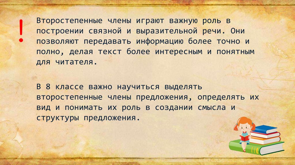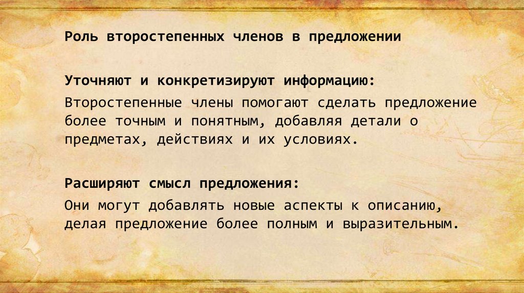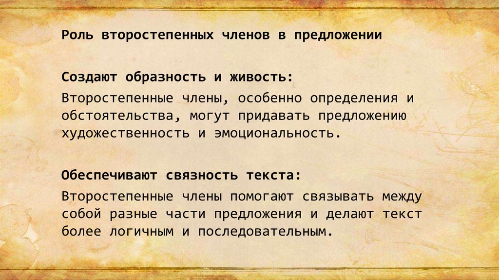 Второстепенные члены играют важную роль впостроении связной и выразительной речи. Они