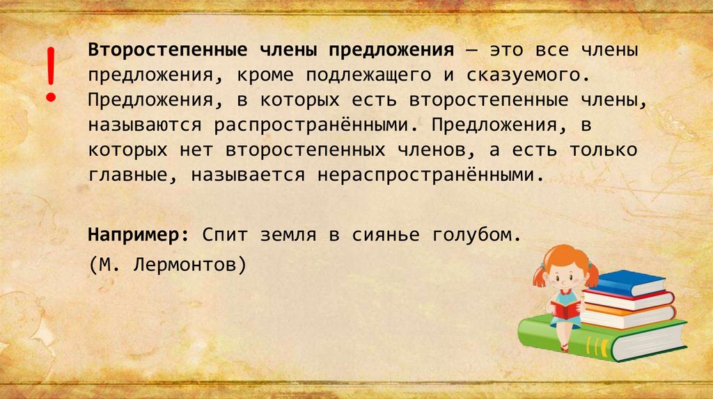 Второстепенные члены предложения – это слова,которые поясняют и дополняют главные члены