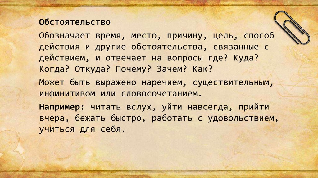 ОбстоятельствоОбозначает время, место, причину, цель, способ