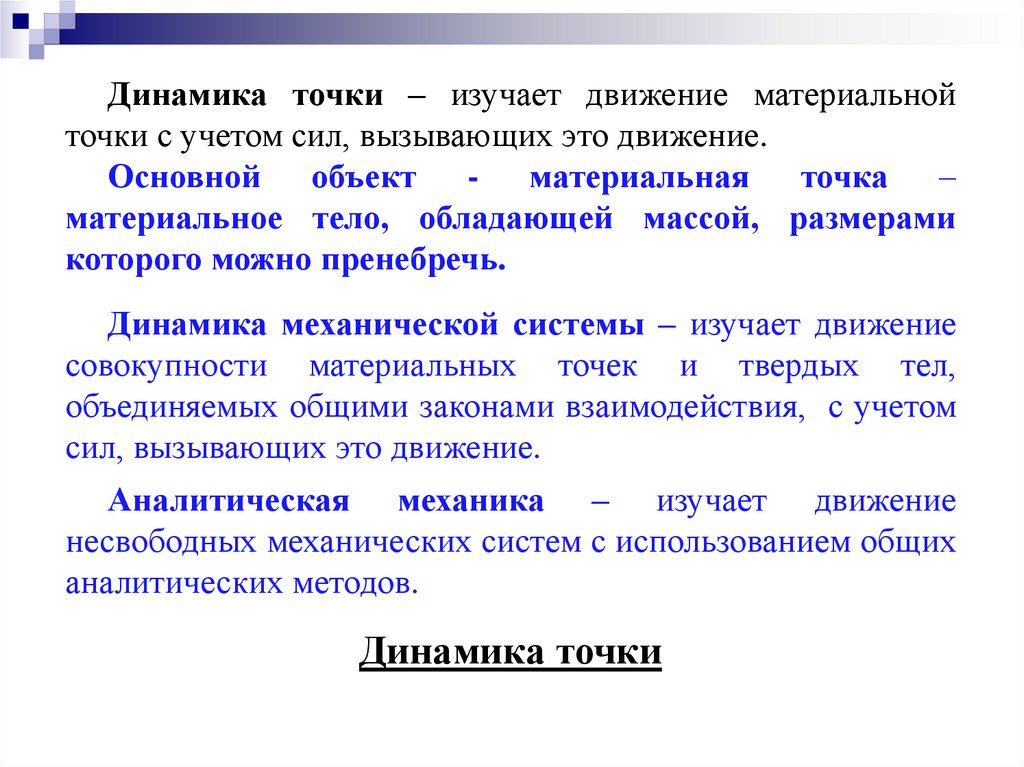 Динамика точки – изучает движение материальнойточки с учетом сил, вызывающих это движение.