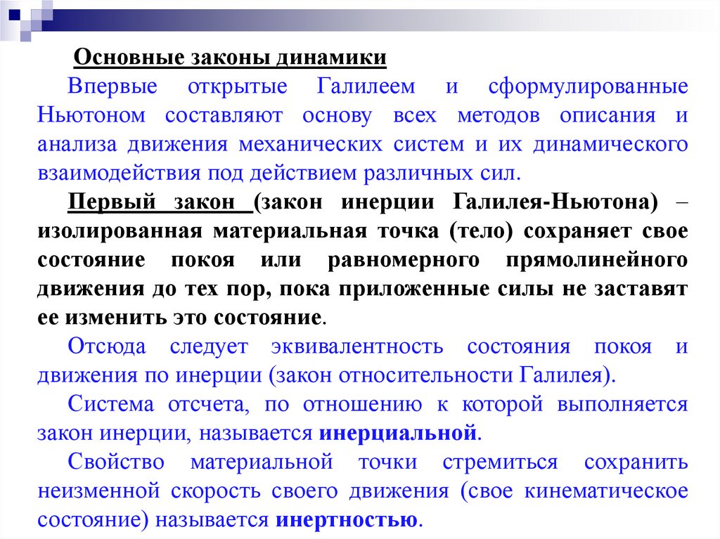 Основные законы динамикиВпервые открытые Галилеем и сформулированные