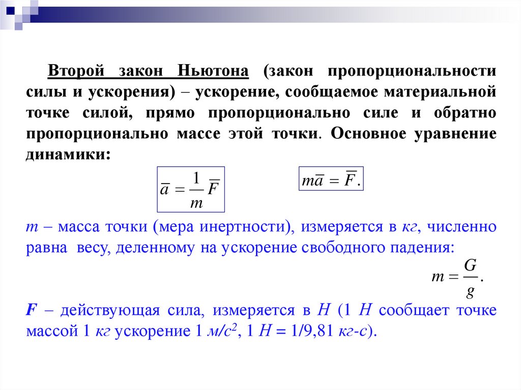F – действующая сила, измеряется в Н (1 Н сообщает точке