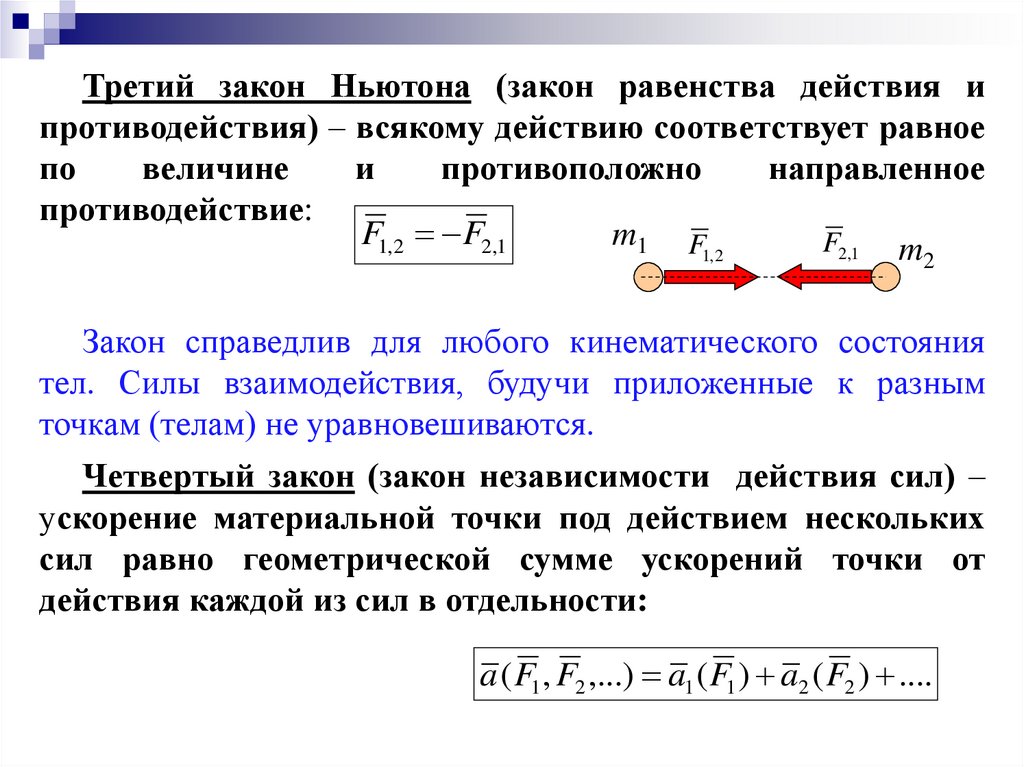 Третий закон Ньютона (закон равенства действия ипротиводействия) – всякому действию соответствует равное
