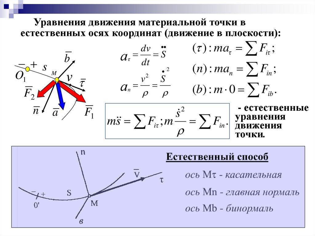 Уравнения движения материальной точки вестественных осях координат (движение в плоскости):