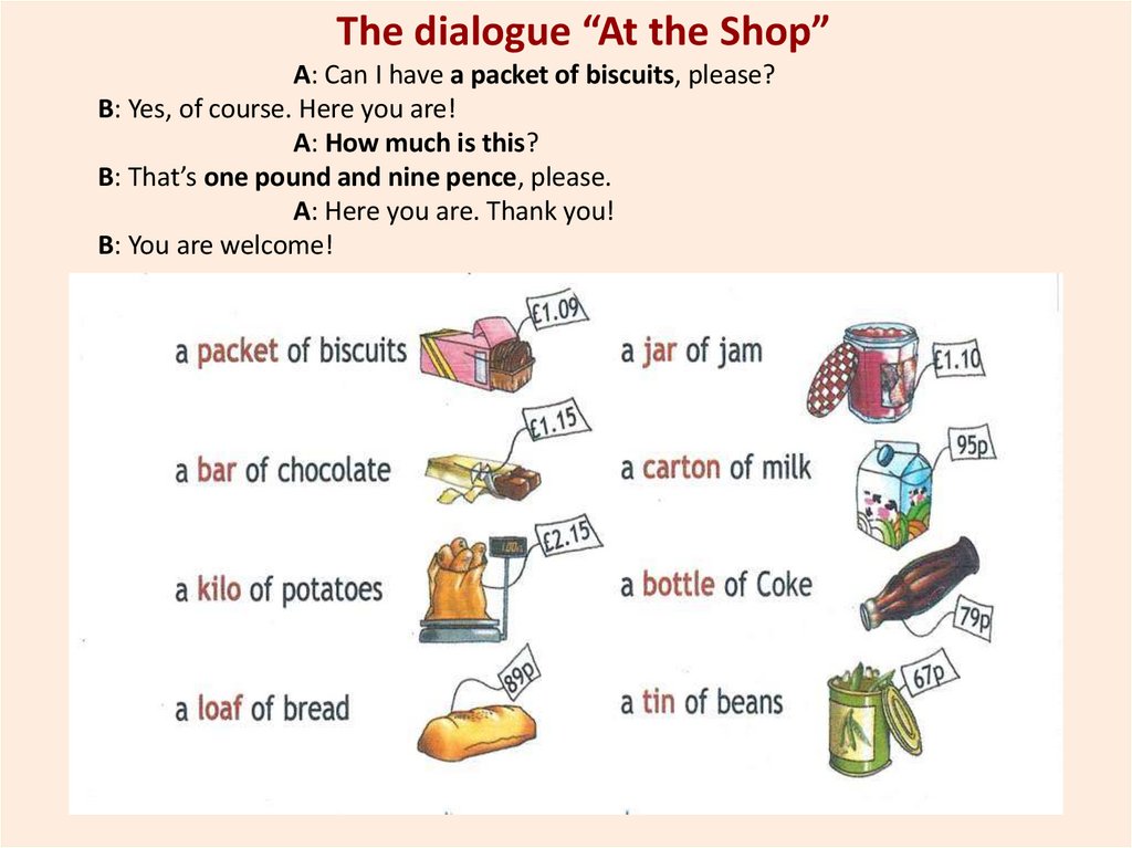 The dialogue “At the Shop”A: Can I have a packet of biscuits, please?