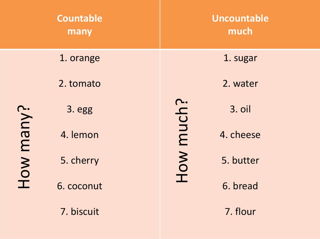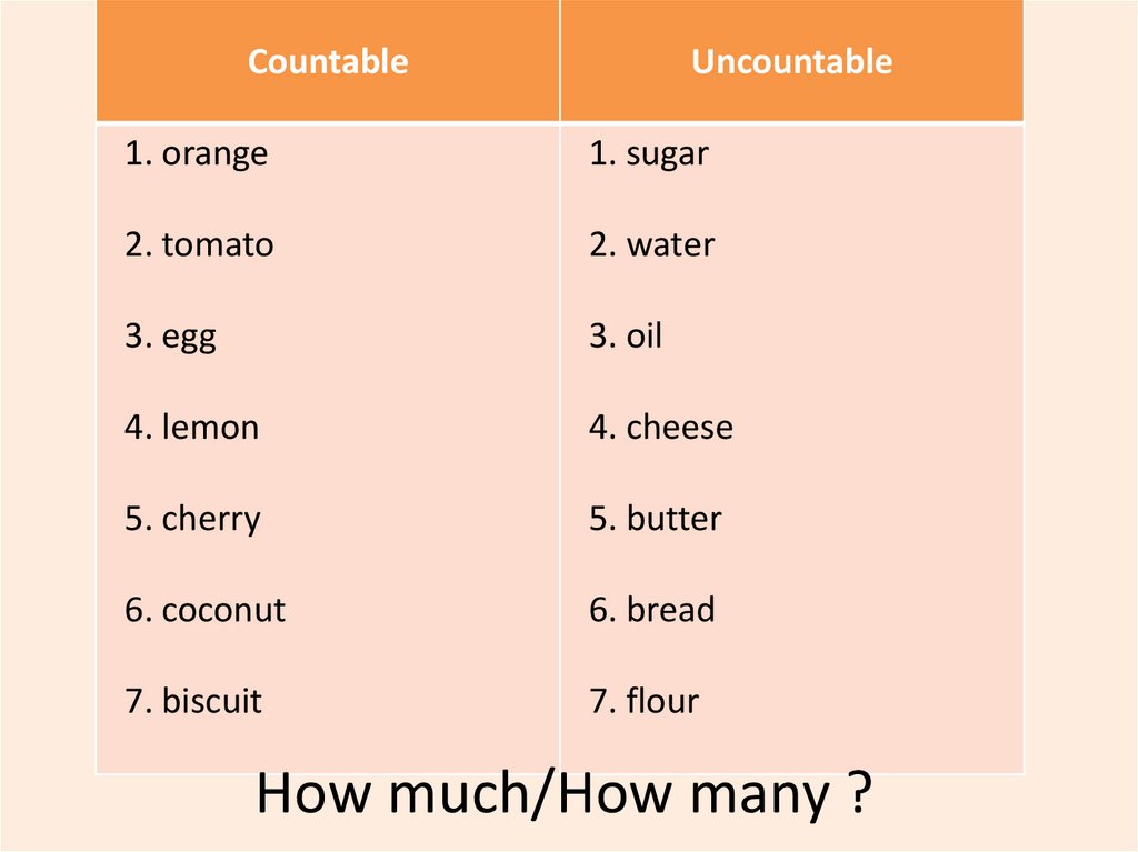 Put the words into the right column: countable and uncountable nounssugar, water, orange, tomato, egg, oil, cheese, lemon,