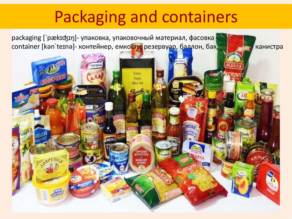 Packaging and containerspackaging [ˈpækɪʤɪŋ]- упаковка, упаковочный материал, фасовка