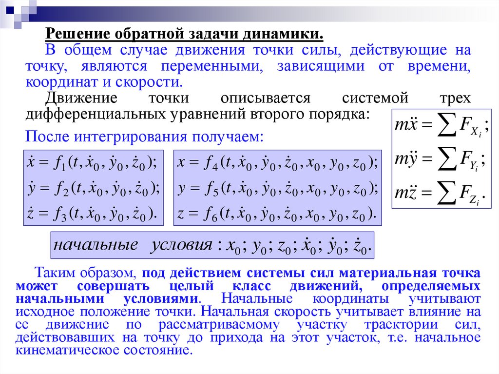 Решение обратной задачи динамики.В общем случае движения точки силы, действующие на