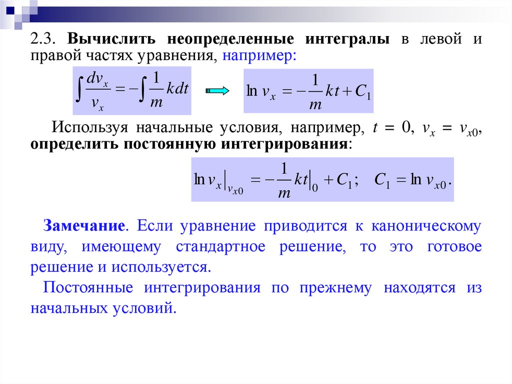 2.3. Вычислить неопределенные интегралы в левой иправой частях уравнения, например: