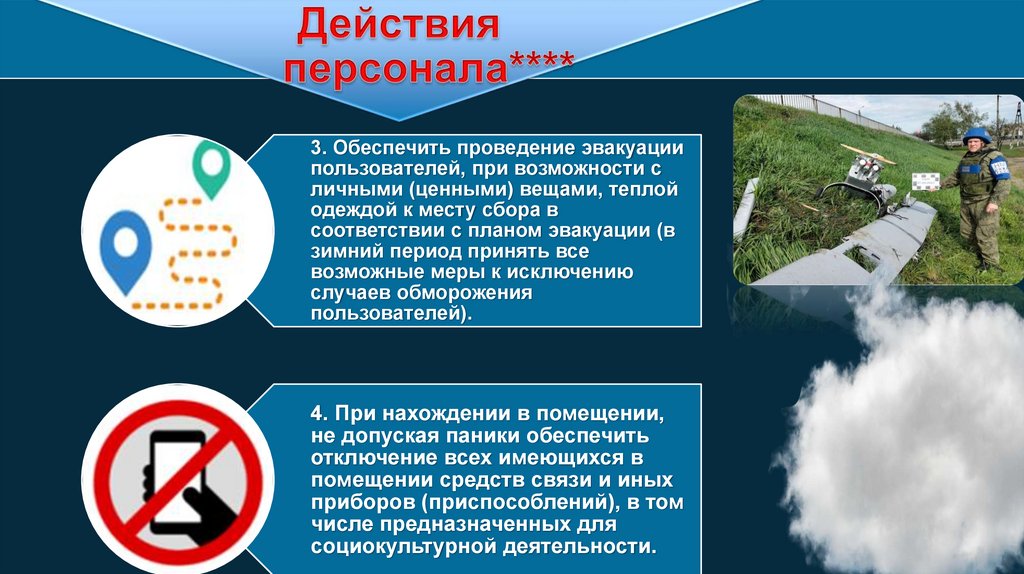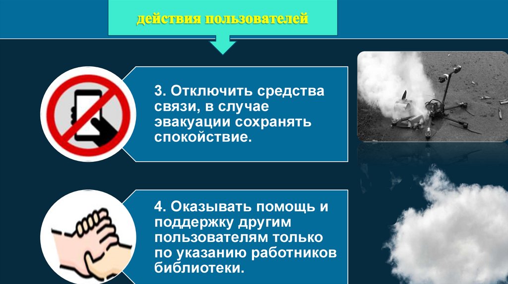 3. Обеспечить проведение эвакуациипользователей, при возможности с