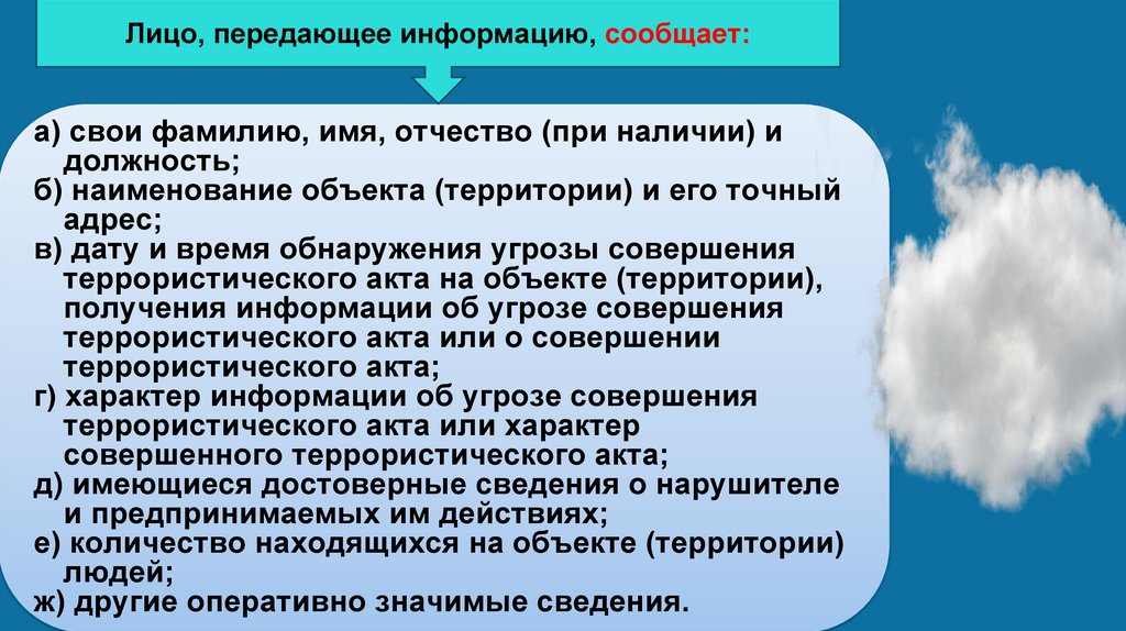 Лицо, передающее информацию, сообщает:а) свои фамилию, имя, отчество (при наличии) и