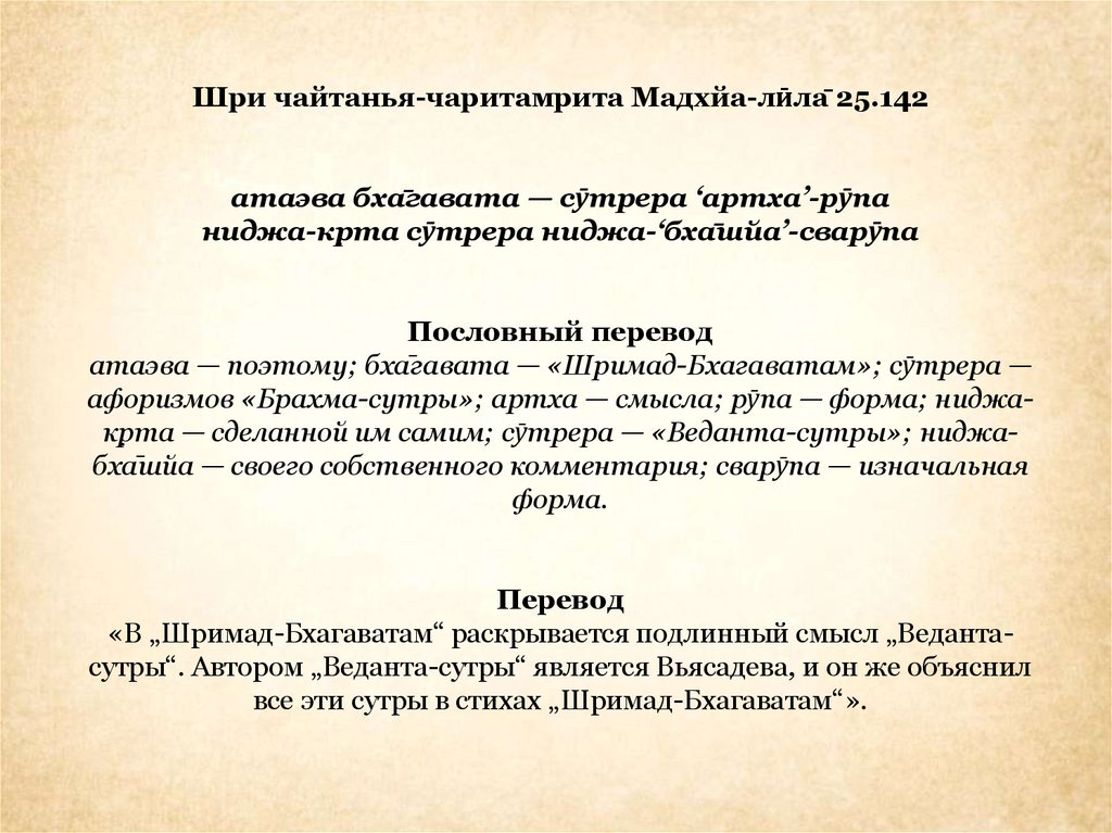 афоризмов «Брахма-сутры»; артха — смысла; рӯпа — форма; ниджакр̣та — сделанной им самим; сӯтрера — «Веданта-сутры»; ниджабха̄шйа — своего собственного комментария; сварӯпа — изначальная