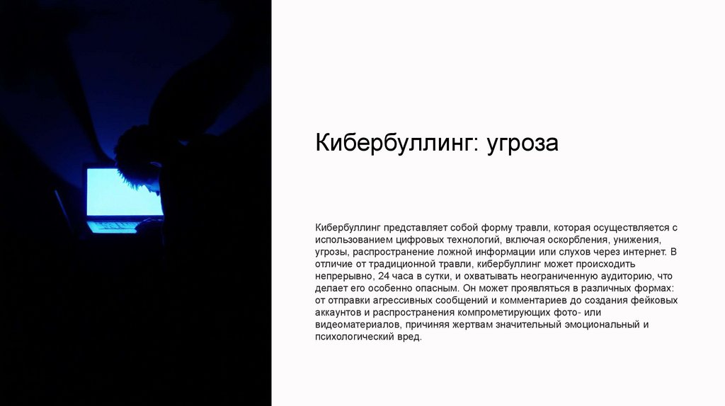 Кибербуллинг: угрозаКибербуллинг представляет собой форму травли, которая осуществляется с
