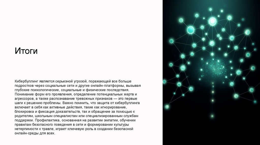 Кибербуллинг — это серьезная и актуальная проблема современного общества, требующая постоянного внимания и осознания.