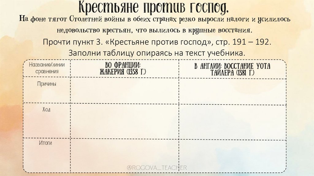 Прочти пункт 3. «Крестьяне против господ», стр. 191 – 192.