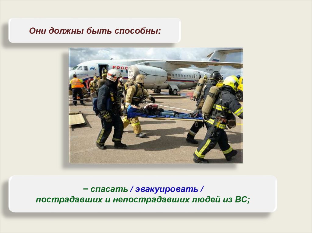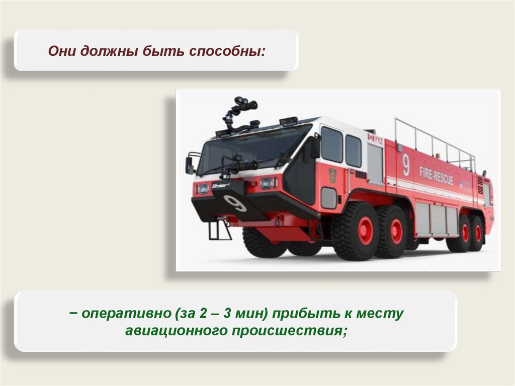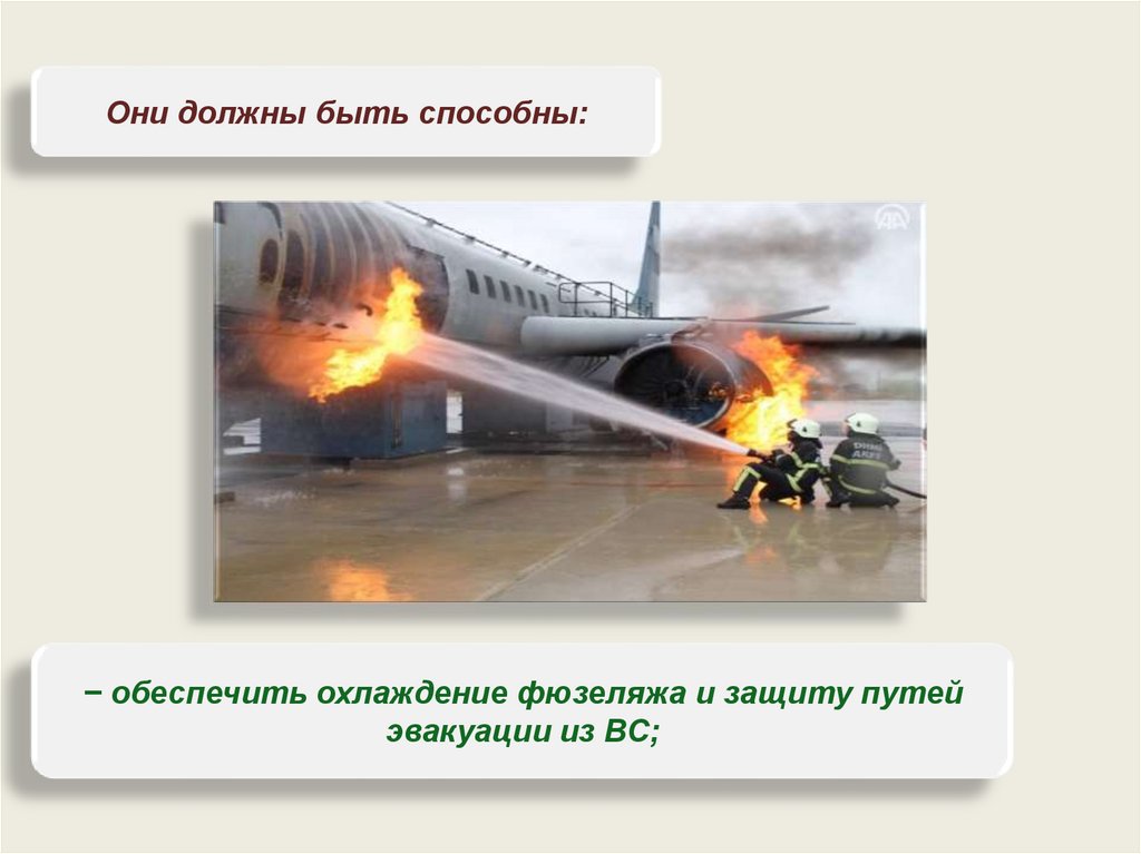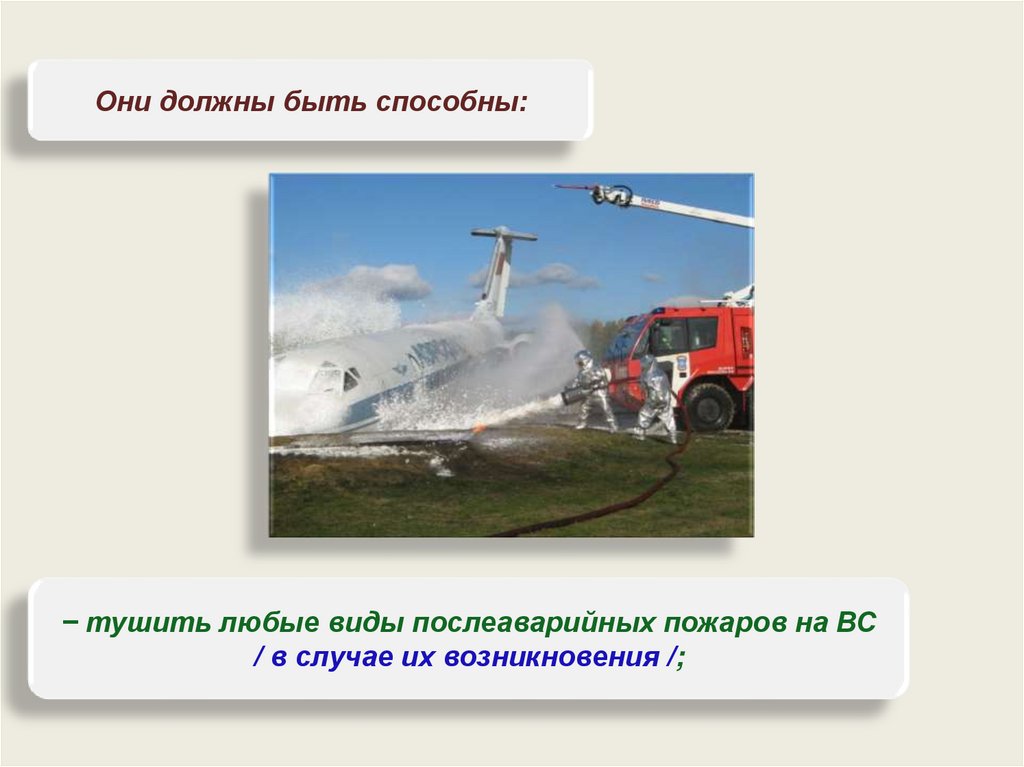 Они должны быть способны:− тушить любые виды послеаварийных пожаров на ВС