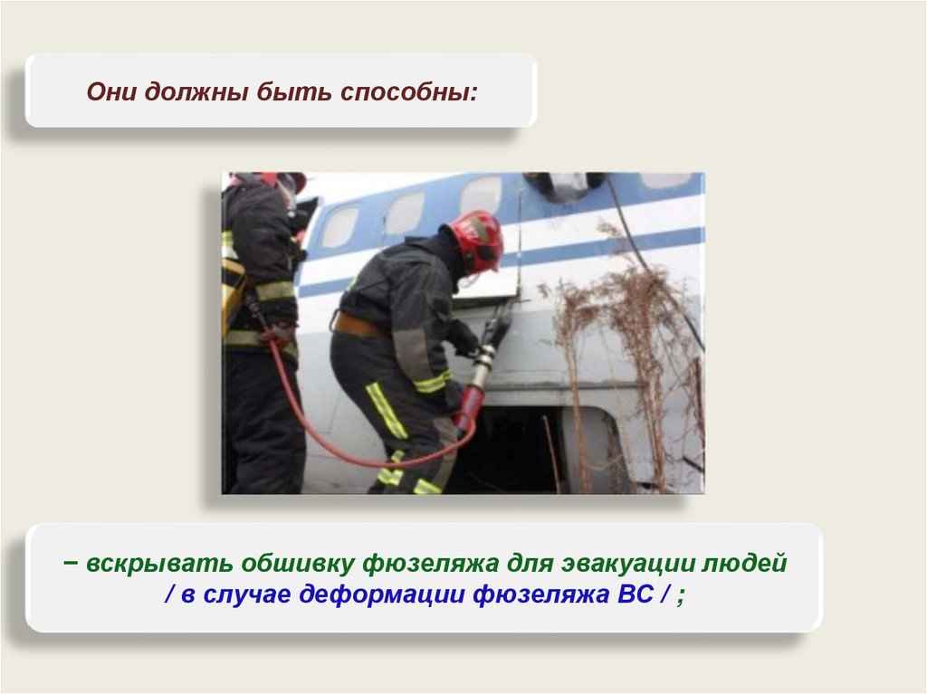Они должны быть способны:− вскрывать обшивку фюзеляжа для эвакуации людей