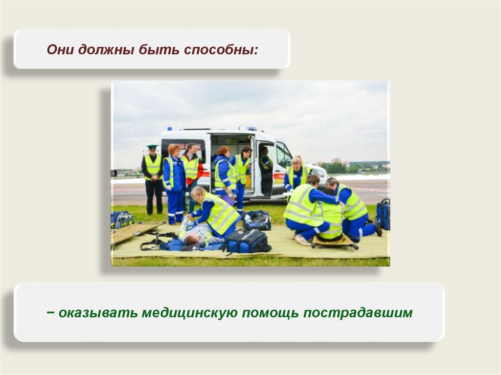 Они должны быть способны:− оказывать медицинскую помощь пострадавшим