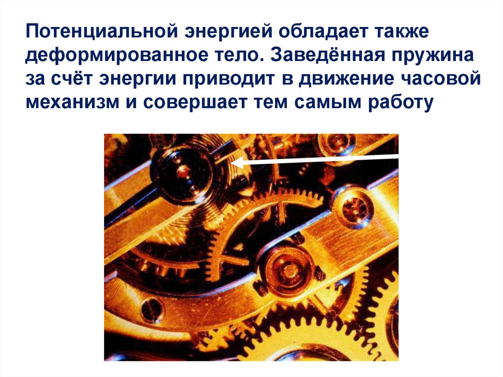 Потенциальной энергией обладает такжедеформированное тело. Заведённая пружина