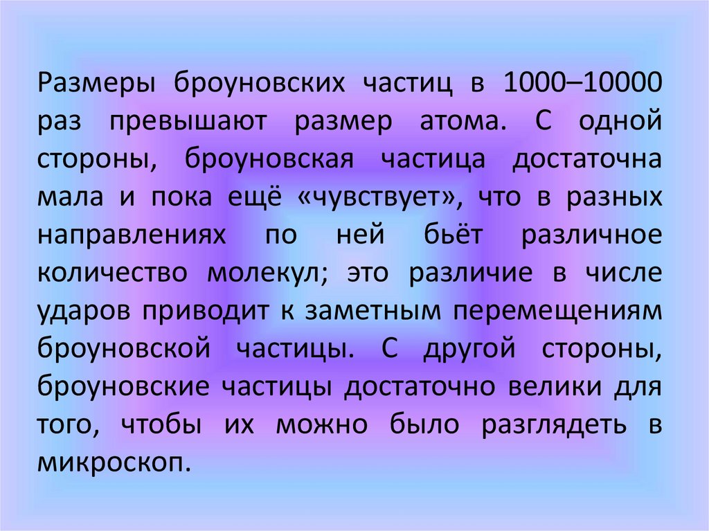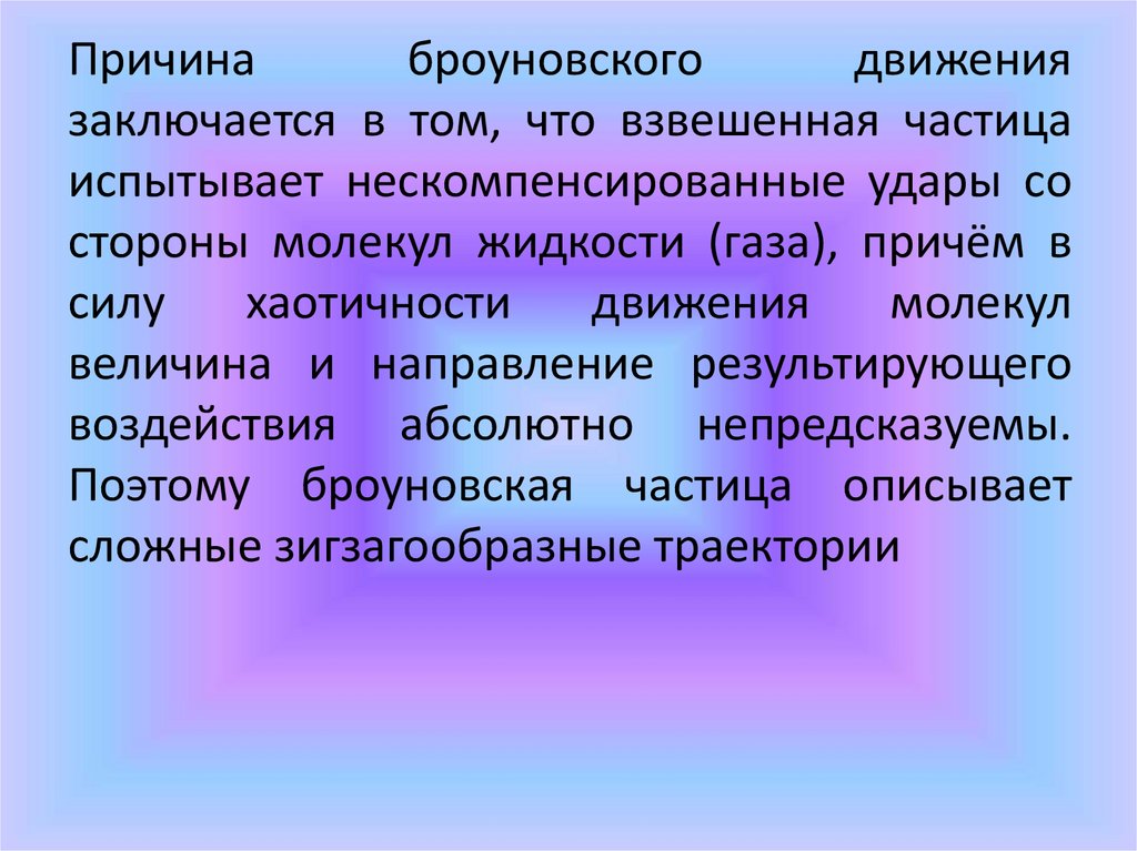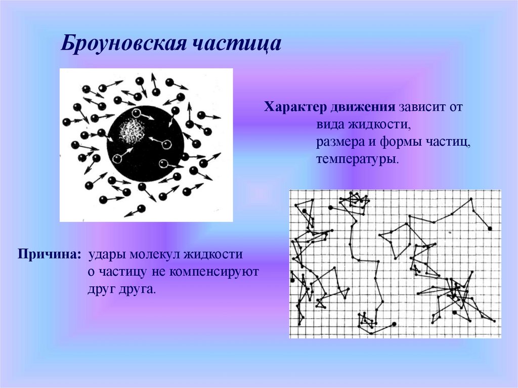 19. Броуновское движение (Роберт Броун 1827 г.) Броуновское движение это – тепловое, беспорядочное движение взвешенных в жидкости