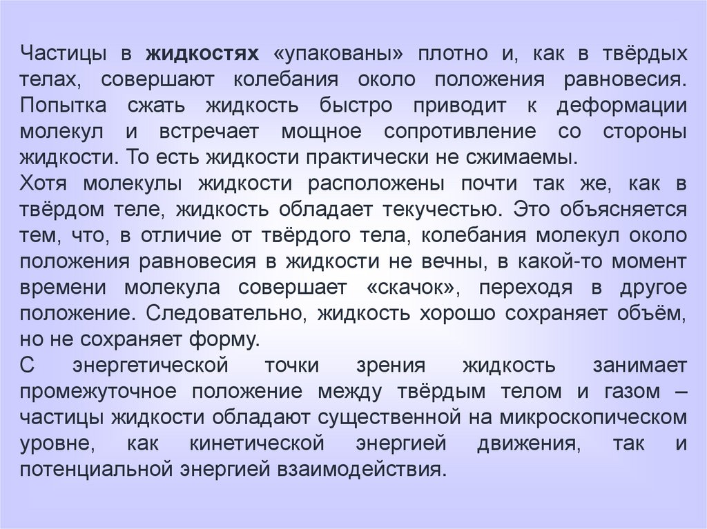 Частицы в жидкостях «упакованы» плотно и, как в твёрдыхтелах, совершают колебания около положения равновесия.