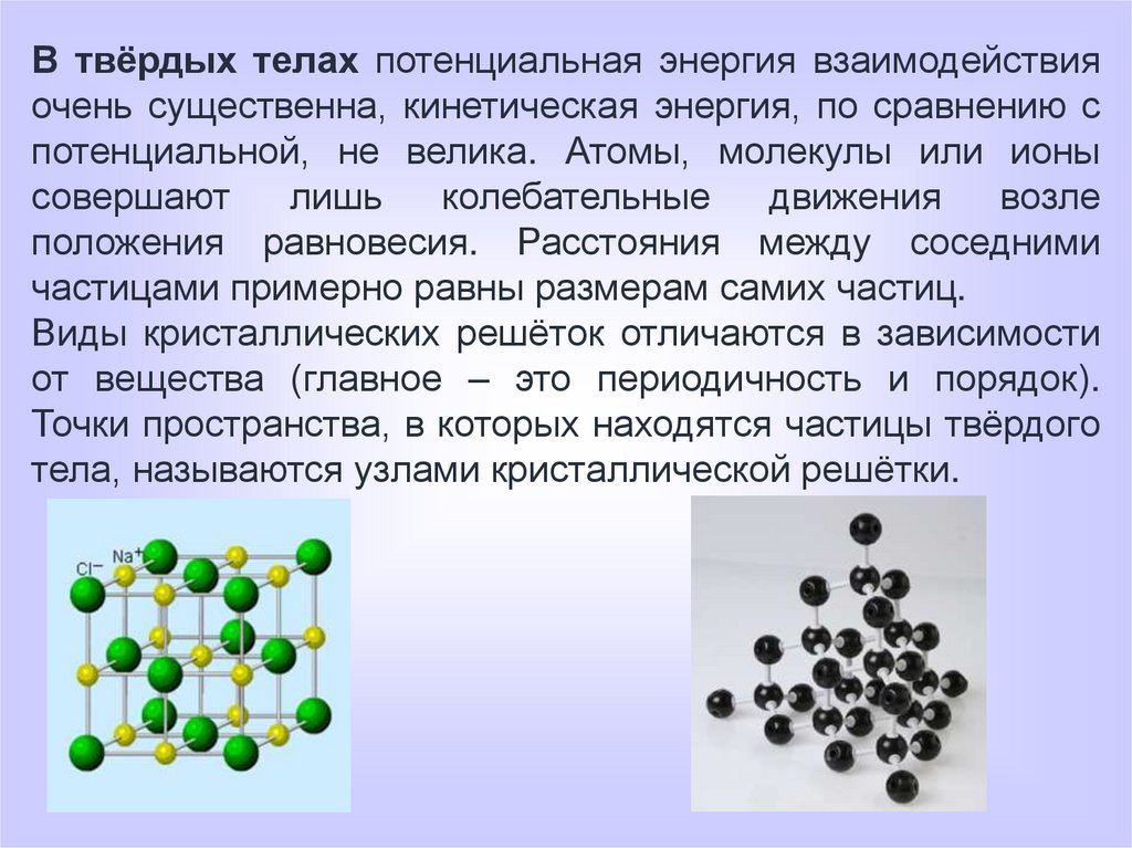 В твёрдых телах потенциальная энергия взаимодействияочень существенна, кинетическая энергия, по сравнению с