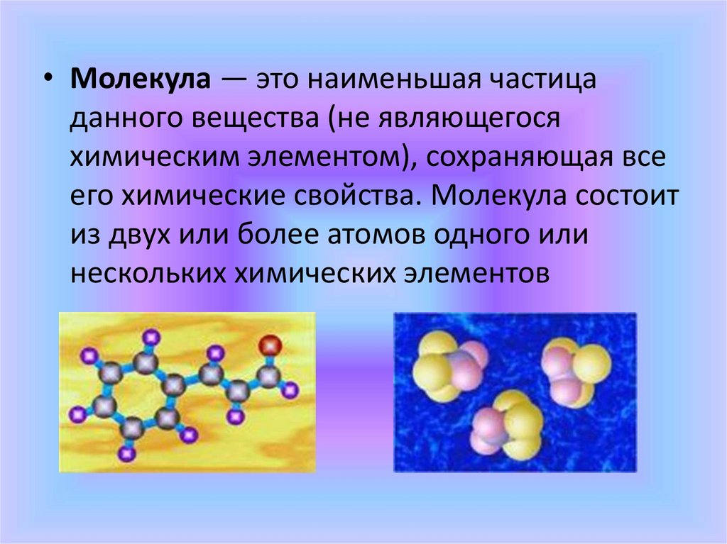 • Молекула — это наименьшая частицаданного вещества (не являющегося
