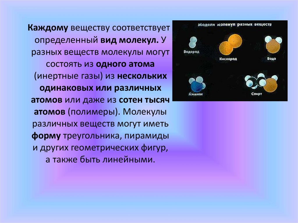 Каждому веществу соответствуетопределенный вид молекул. У