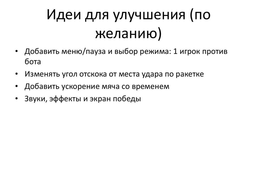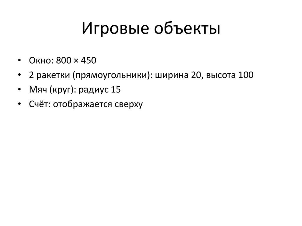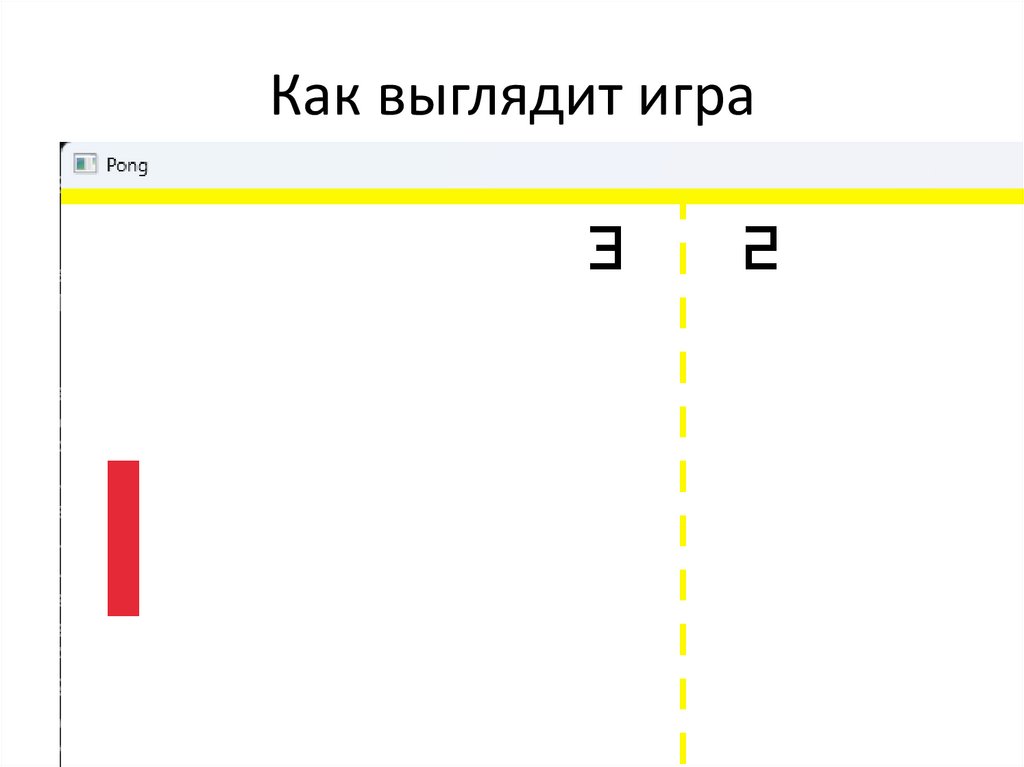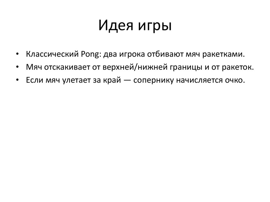 Идея игры• Классический Pong: два игрока отбивают мяч ракетками.